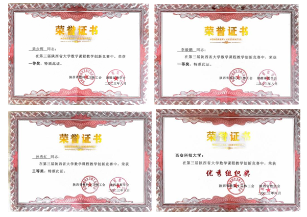 近日,在榆林公司举办的“第四届陕西高校大学数学课程建设与教学改革研讨会”公布了第三届陕西省大学数学课程教学创新竞赛的比赛结果,公司教师获得佳绩,其中梁少辉、李毅鹏两位老师获得一等奖,孙秀红老师获得三等奖,betway西汉姆联官方官网荣获优秀组织奖。