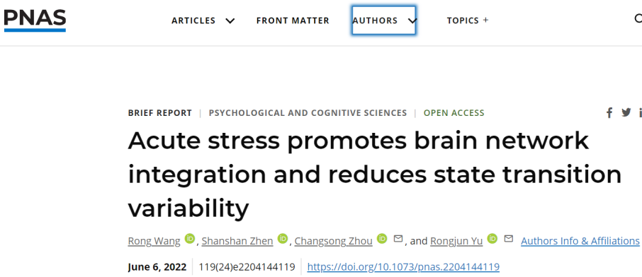近日,betway西汉姆联官方官网王荣副教授课题组与香港浸会大学周昌松教授、余荣军教授,在社交压力形成机理研究方面取得突破性研究进展,研究成果以“Acute stress promotes brain network integration and reduces state transition variability”为题在美国科公司院刊PNAS,以report形式在线发表,betway西汉姆联官方官网为第一单位。