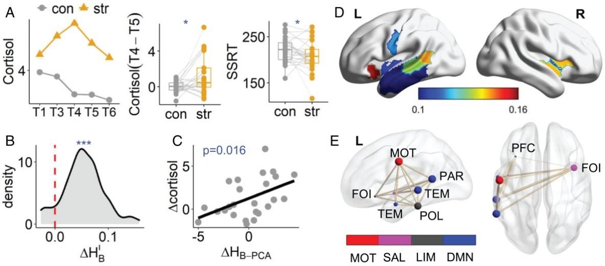 该工作揭示了大脑能够动态地维持在一个高整合性,低分离性的网络组织状态,以应对一定程度的急性社会压力。脑网络变化与压力下皮质醇浓度及认知控制能力提高有相关,对压力相关的精神疾病具有重要的理论和临床指导意义。