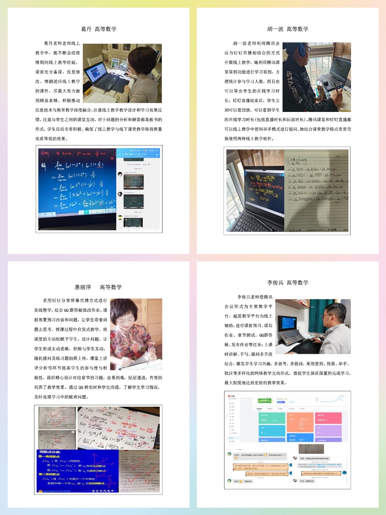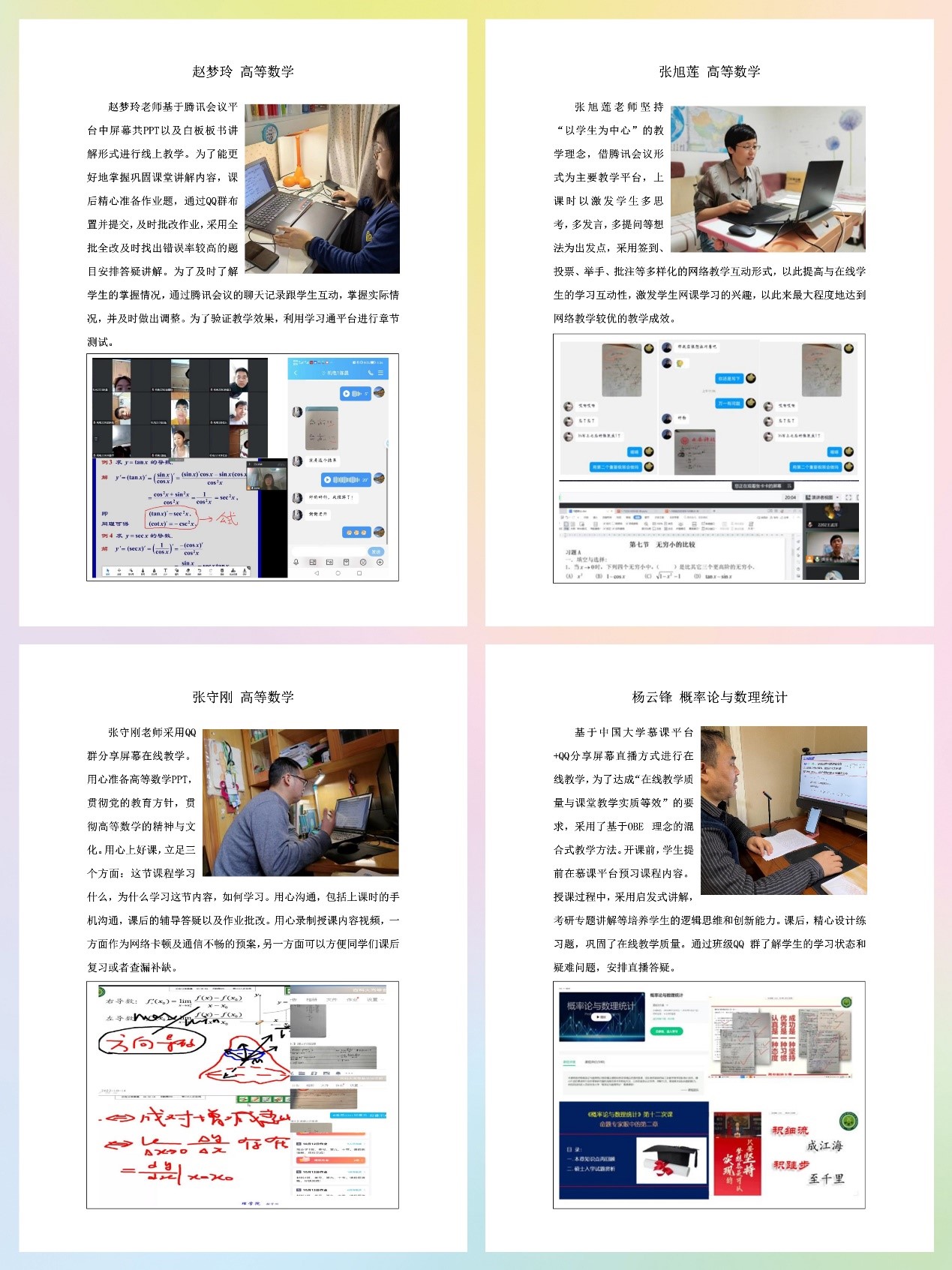 老师们有的自购书写板课堂上板书,一步步推导,一步步演绎,一步步启发,及时互动,同学们反映效果非常好;有的连麦互动,耐心讲解,开展有效教学;有的录制重点题目讲解视频,不分昼夜地为同学答疑解惑;有的通过设置签到、抢答、选答等环节提高同学们的学习积极性;有的利用疫情防控、党的二十大这些现实教材,坚定爱国主义情怀,开展“课程思政”。
