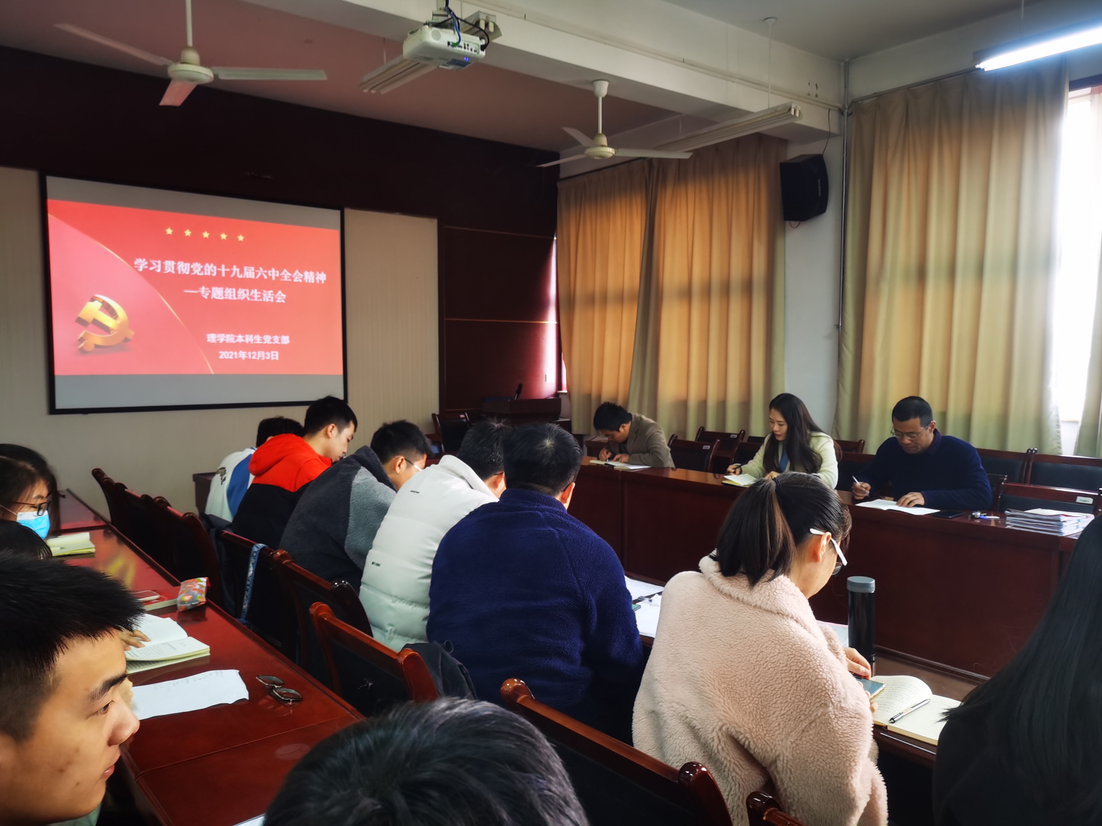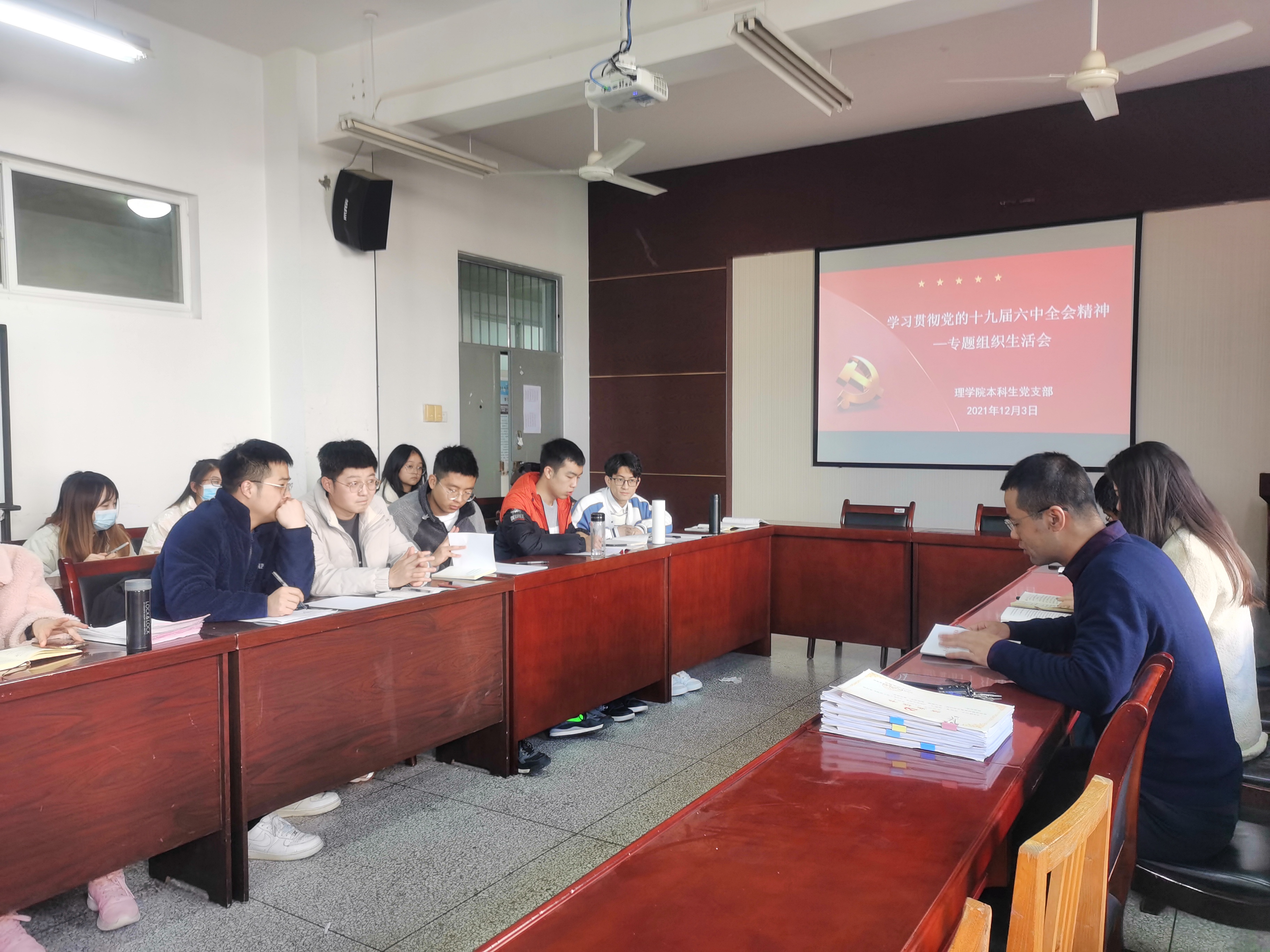 12月3日上午,betway西汉姆联官方官网本科生党支部在实验楼220会议室召开学习贯彻党的十九届六中全会精神专题组织生活会,会议由党支部书记侯斌刚主持,支部全体成员参会。