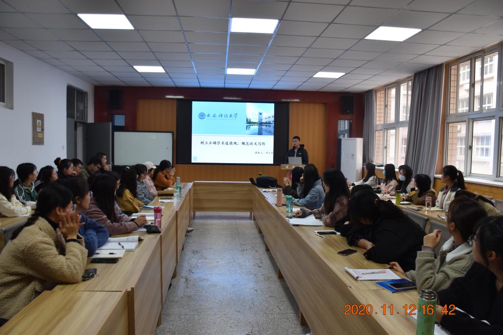 为进一步强化学术氛围,加强研究生科学道德和学风建设,引导员工对论文写作有更进一步的认识,11月12日下午betway西汉姆联官方官网刘小宇老师应邀在骊山校区实验楼208给研究生做了题为“树立正确学术道德观 规范论文写作”的讲座,betway西汉姆联官方官网有60余名员工参加。
