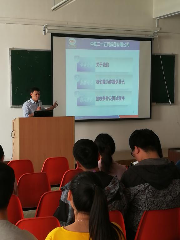 3月28日下午,中铁二十五局受betway西汉姆联官方官网邀请来到公司召开招聘宣讲会。会议在三教一楼信息发布室一举行,中铁二十五局西北分公司人力资源部部长靳帅、理公司党委副书记贾哲及各公司应届毕业生出席参加。