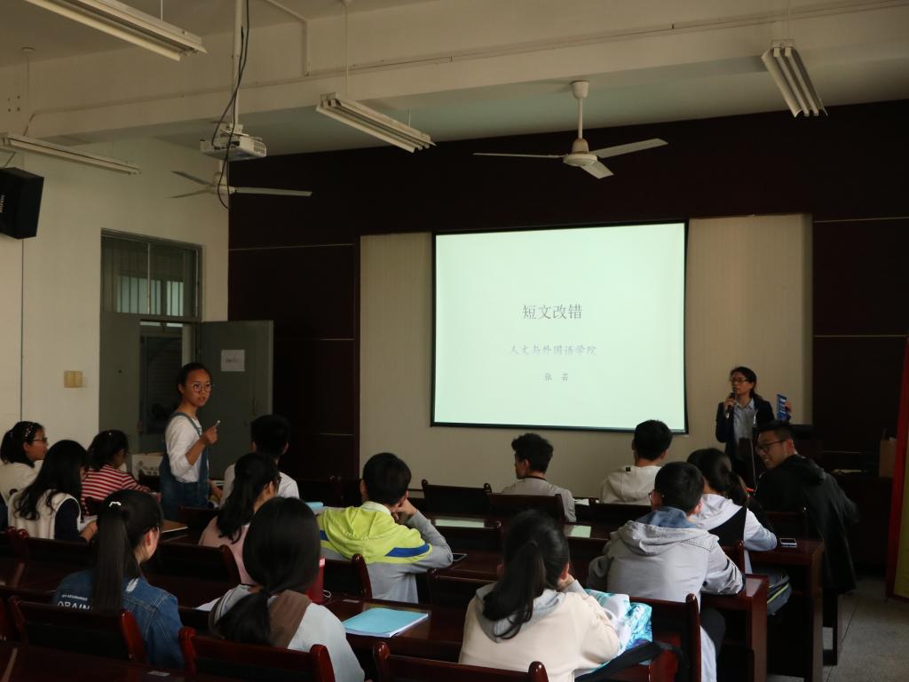 本次培训以短文改错为主题。现场进行改错训练,以时态一致、主谓一致、注重反义词、区别主被动等多个常见错误进行分析讲解。