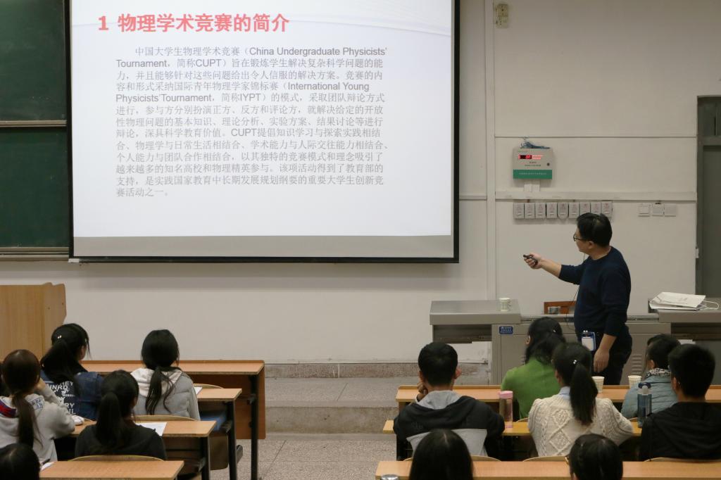 会议开始,闫小乐老师对关于此次竞赛的相关信息给同学们进行了普及。betway西汉姆联官方官网老员工物理学术竞赛以培养参赛者的创新意识、创新能力、协作精神和实践能力为根本理念,是一项以团队对抗为形式的物理竞赛。之后,闫老师又对竞赛规则进行介绍,并演示了答题范例。接下来,闫老师对每一道选题也做了引导性的解说,讲话生动而不失严谨,勾起了同学们对动手实验、探究问题的兴趣。