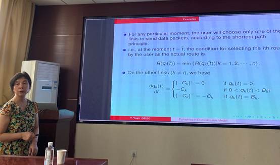 袁教授从非光滑系统的动力学模型出发,介绍了常用的定性分析理论。同时,以计算机网络中的拥塞实际问题为例,建立了描述最短路径的具有BODR特点的拥塞控制非光滑系统。最后,袁教授还分享了捕食被捕食扩散模型方面的最新研究成果。