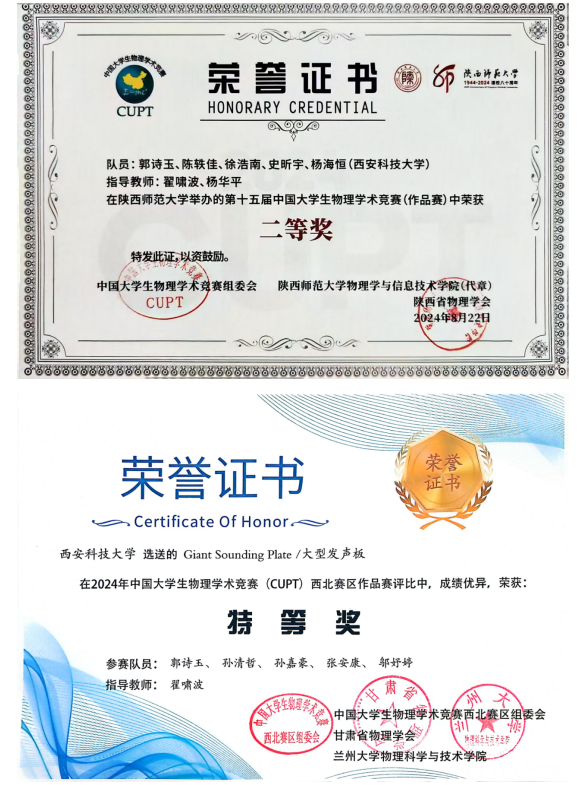 8月18日至23日,第十五届中国老员工物理学术竞赛在陕西师范大学长安校区举办。公司首次入围CUPT全国赛作品赛道(共28所高校),经激烈角逐,由翟啸波、杨华平老师指导的“大型发声板”作品脱颖而出,荣获“第十五届中国老员工物理学术竞赛(作品赛)”二等奖。CUPT全国赛包括团体赛和作品赛两个赛道,参赛高校需经过各区域竞赛遴选。此前,在西北区域赛中,公司荣获团体赛一等奖2项,作品赛特等奖1项,一等奖1项和二等奖1项的历史最好成绩,并获取了全国赛的参赛资格。