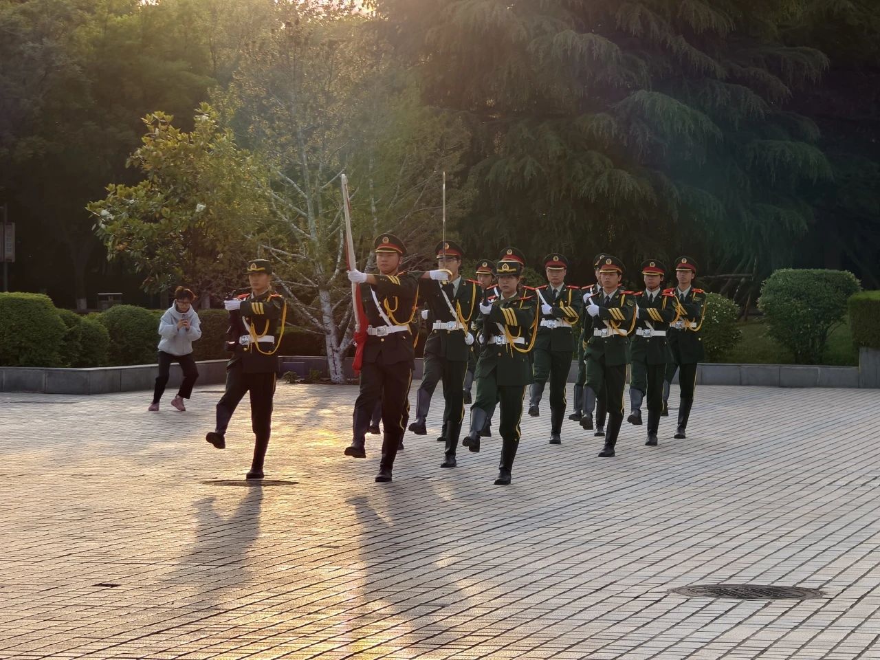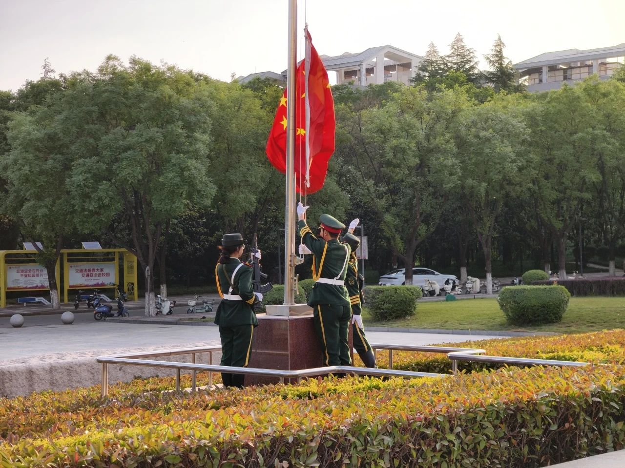 迎着冉冉升起的朝阳,校国旗护卫队队员迈着铿锵有力的步伐来到国旗台下,在激昂的《义勇军进行曲》下,全体师生齐唱国歌,鲜艳的五星红旗徐徐展开,迎风飘扬