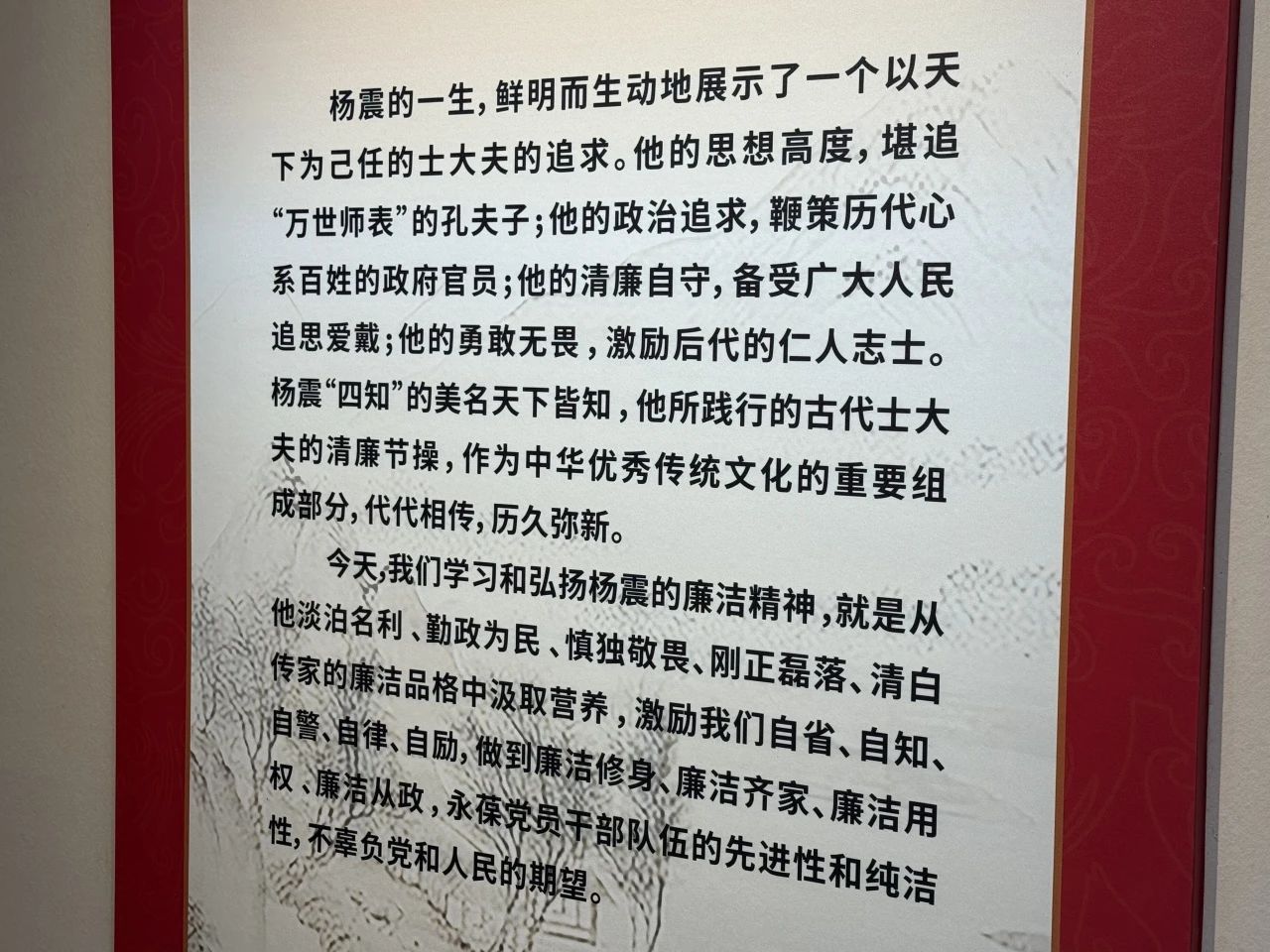 “以前在课本上学习过杨震的故事,今天来到现场,听着同学的讲解,仿佛穿越了千年时光,真切感受到了那份穿越时空的廉洁力量。”