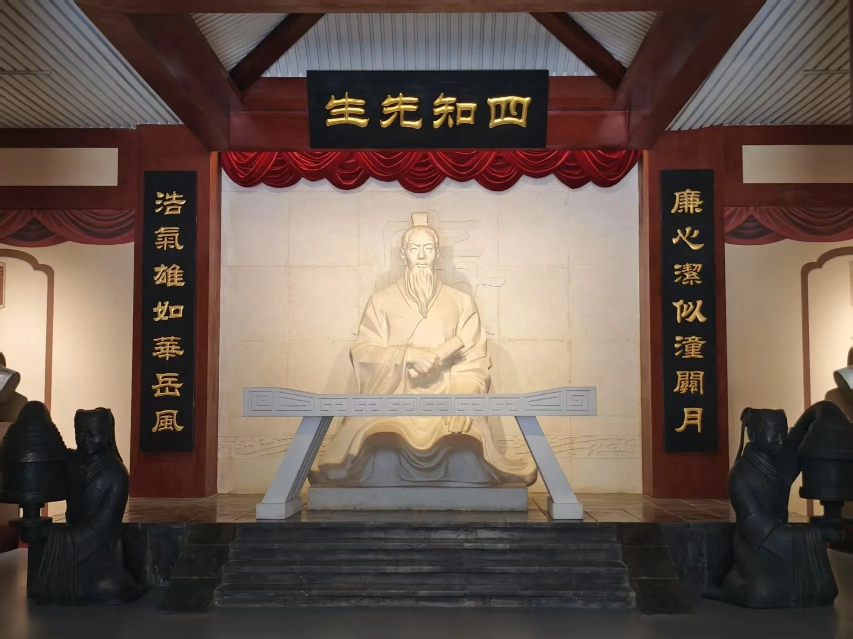 杨震廉政博物馆以东汉名臣杨震的 “四知” 故事为核心,集中展示了杨震的生平事迹、廉政思想以及中国历代廉政文化的发展脉络。活动中,同学们认真观看馆内的文物展品、图文资料和场景复原,详细了解杨震 “暮夜却金” 的典故 —— 当有人深夜向他行贿时,他以 “天知、神知、我知、子知” 严词拒绝,其清正廉洁的高尚品格让在场每一位同学深受触动。
