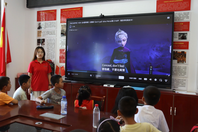 郭思妍发挥专业优势,以英文影视配音为载体,创新开展情景化语言教学。通过经典片段演绎、英文歌曲赏析等多元形式,构建沉浸式英语学习环境。留守儿童们展现出浓厚学习兴趣,在配音实践中提高了口语表达水平,锻炼了语言思维能力。