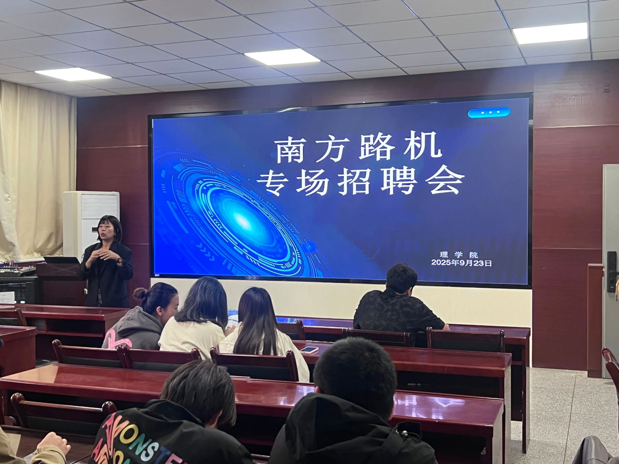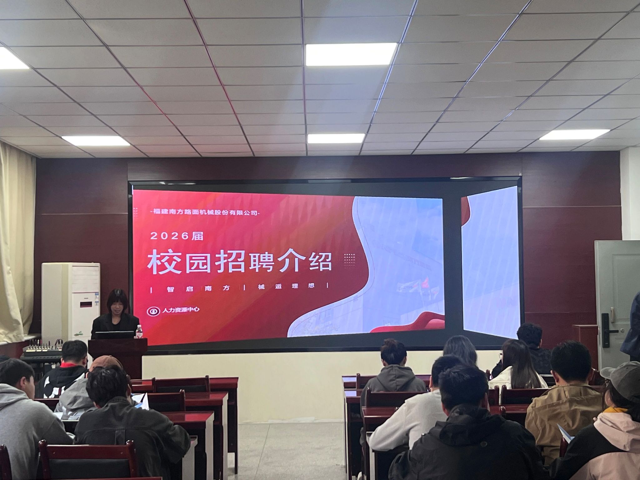 招聘会上,南方路机招聘负责人首先介绍了企业概况,详细阐述了公司在工程装备制造领域的行业地位、核心业务布局及未来发展规划。作为国内工程机械装备领域的领军企业,南方路机在绿色建材装备、建筑废弃物资源化利用等方面的技术优势与创新成果,使同学们对企业的发展前景有了清晰认识。