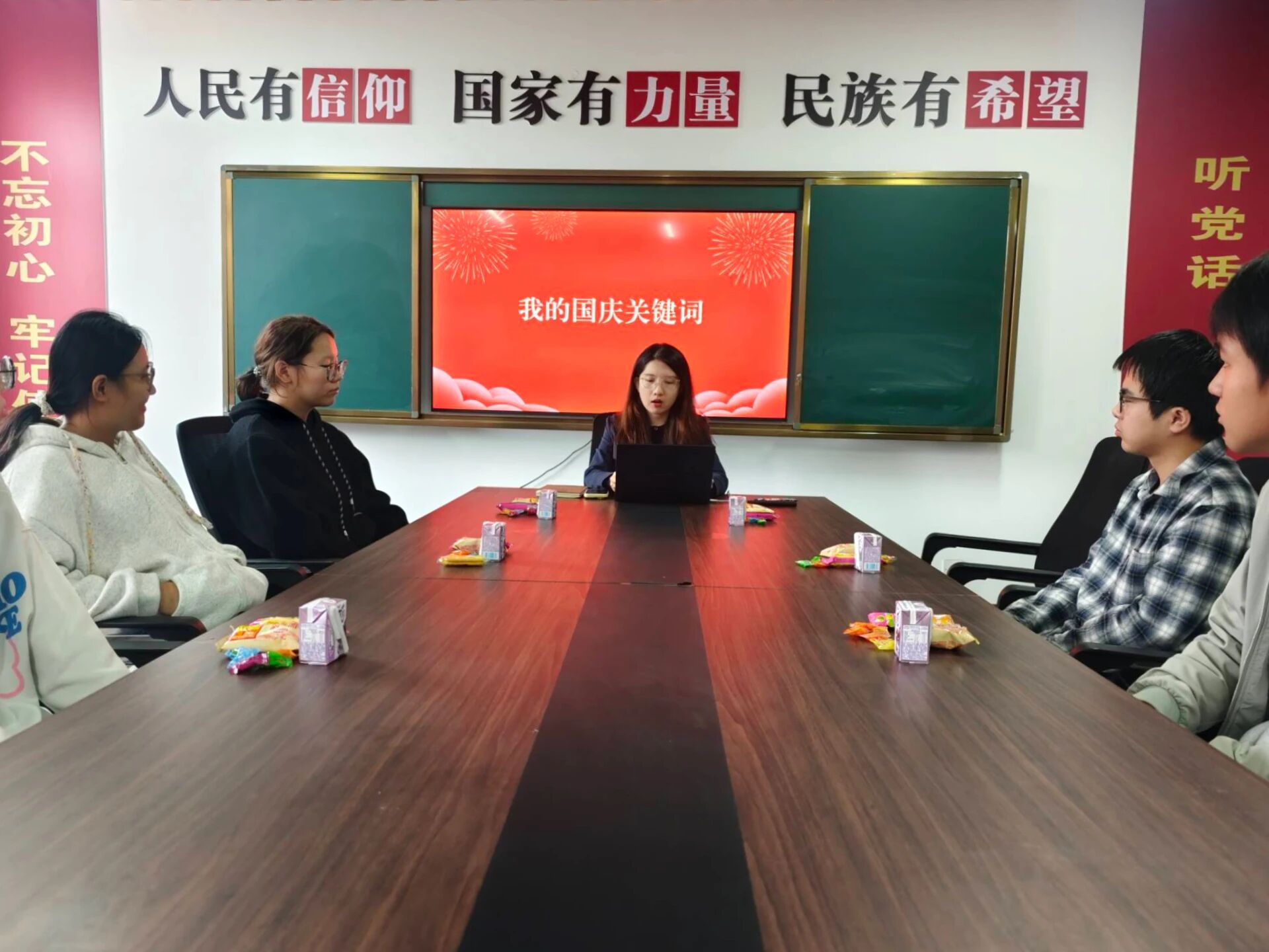 在“我的国庆关键词”环节,同学们踊跃发言,用“自豪”、“奋进”、“责任”、“希望”等词汇,表达了对国家繁荣富强的真切感受与作为新时代青年的使命担当。一个个关键词,凝聚了同学们对祖国母亲的深情祝福与对未来发展的坚定信心。