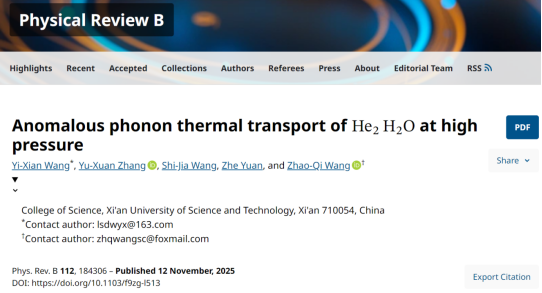 王乙先副教授与王朝棋副教授团队在高压物理研究领域取得重要进展。其关于高压下He2H2O异常声子热输运行为的研究成果,以“Anomalous phonon thermal transport of He2H2O at high pressure”为题发表于凝聚态物理领域权威期刊《Physical Review B》(自然指数期刊)。该成果由王乙先副教授担任第一作者,2023级硕士研究生张宇轩为第二作者,王乙先、王朝棋副教授共同担任通讯作者,betway西汉姆联官方官网为唯一通讯单位。研究揭示了氦-水化合物在高压下的异常声子热输运机制,其显著的声子热传输抑制效应可能会改变冰巨星深层的电导分布和抑制氢-氦相分层,为解释冰巨星内部的多极磁场与异常热流,以及理解其动力学过程与热演化历史提供了关键理论依据。