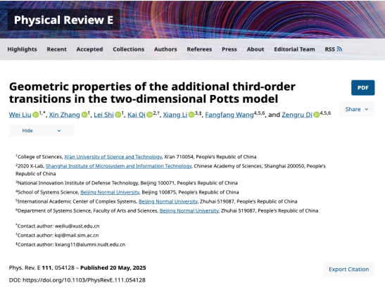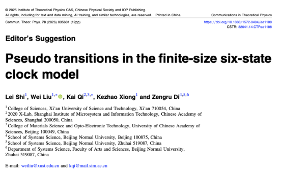 刘伟副教授与熊科诏副教授团队在复杂系统临界态预警的基础理论研究方面取得重要进展。相关研究成果以系列论文形式分别发表于统计物理领域权威期刊《Physical Review E》、《Physics Letters A》和《Communications in Theoretical Physics》,包括题为“Geometric properties of the additional third-order transitions in the two-dimensional Potts model”,“Pseudo transitions in the finite-size Blume-Capel model”及“Pseudo transitions in the finite-size six-state clock model”的三篇论文,其中第三篇论文入选编辑推荐论文。该系列研究工作由betway西汉姆联官方官网、中国科公司上海微系统与信息技术研究所、中国人民解放军军事科公司及北京师范大学共同合作完成。刘伟副教授与其指导的硕士研究生石雷分别为论文的第一作者,betway西汉姆联官方官网为第一作者单位及共同通讯作者单位。研究揭示了复杂系统在临界区外侧所展现的普适性行为,构建了用于刻画该类行为的新序参量,并提出了一种针对临界相变的早期预警方法。该方法在活性物质体系与人工集群系统等领域具备潜在应用价值,同时也为复杂工业系统中的临界灾害预警研究提供了新的理论支撑。