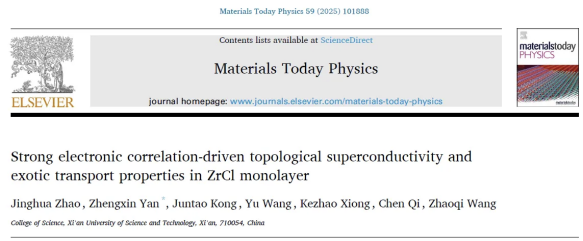 炎正馨教授团队聚焦拓扑器件核心材料研发,在ZrCl单层材料研究中取得重要突破。相关成果以“Strong electronic correlation-driven topological superconductivity and exotic transport properties in ZrCl monolayer”为题,发表于材料科学与应用物理交叉领域TOP期刊《Materials Today Physics》(影响因子9.7)。该成果由2023级硕士研究生赵京华担任第一作者,炎正馨教授为通讯作者,betway西汉姆联官方官网为唯一通讯单位。研究揭示了ZrCl单层材料中强电子关联、拓扑保护与晶格动力学的深度耦合,明确强关联驱动是其非常规拓扑超导态的核心成因。该态具有稳定超导能隙和可控边缘模,为智能超导量子器件奠定基础。其鲁棒的拓扑边缘模可保持量子演化高相干性,显著降低信息传输损耗,为高保真容错量子比特提供新范式,适用于可扩展量子计算芯片。材料的低散射、低能耗电子输运特性使其成为零损耗互连、超低功耗逻辑单元及量子传感器的理想载体,可优化未来信息与能源体系的能耗效率。强关联-超导-拓扑效应的协同调控机制,为自旋电子器件、拓扑晶体管及量子控制组件提供工程化路径,助力我国在量子芯片与前沿信息技术领域占据引领地位。